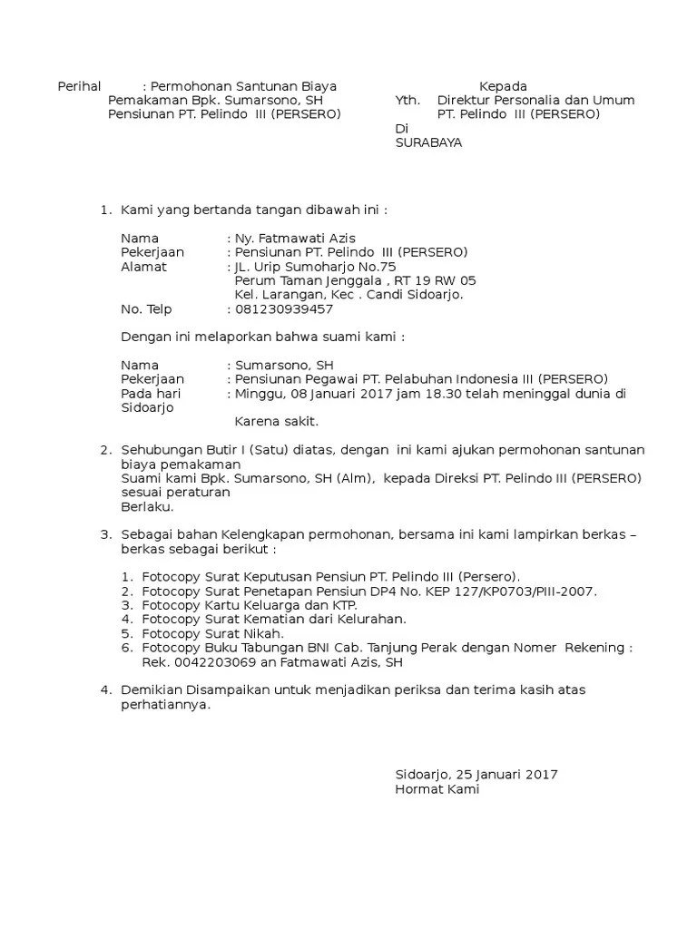 Contoh surat permohonan pengajuan santunan kematian. Surat permohonan dari desa atau kelurahan. Percepatan penanggulangan kemiskinan) dan surat. Contoh surat lamaran (ditulis tangan) yth. Sebagai bahan pertimbangan bersama ini kami lampirkan asli dokumen sebagai berikut**) :